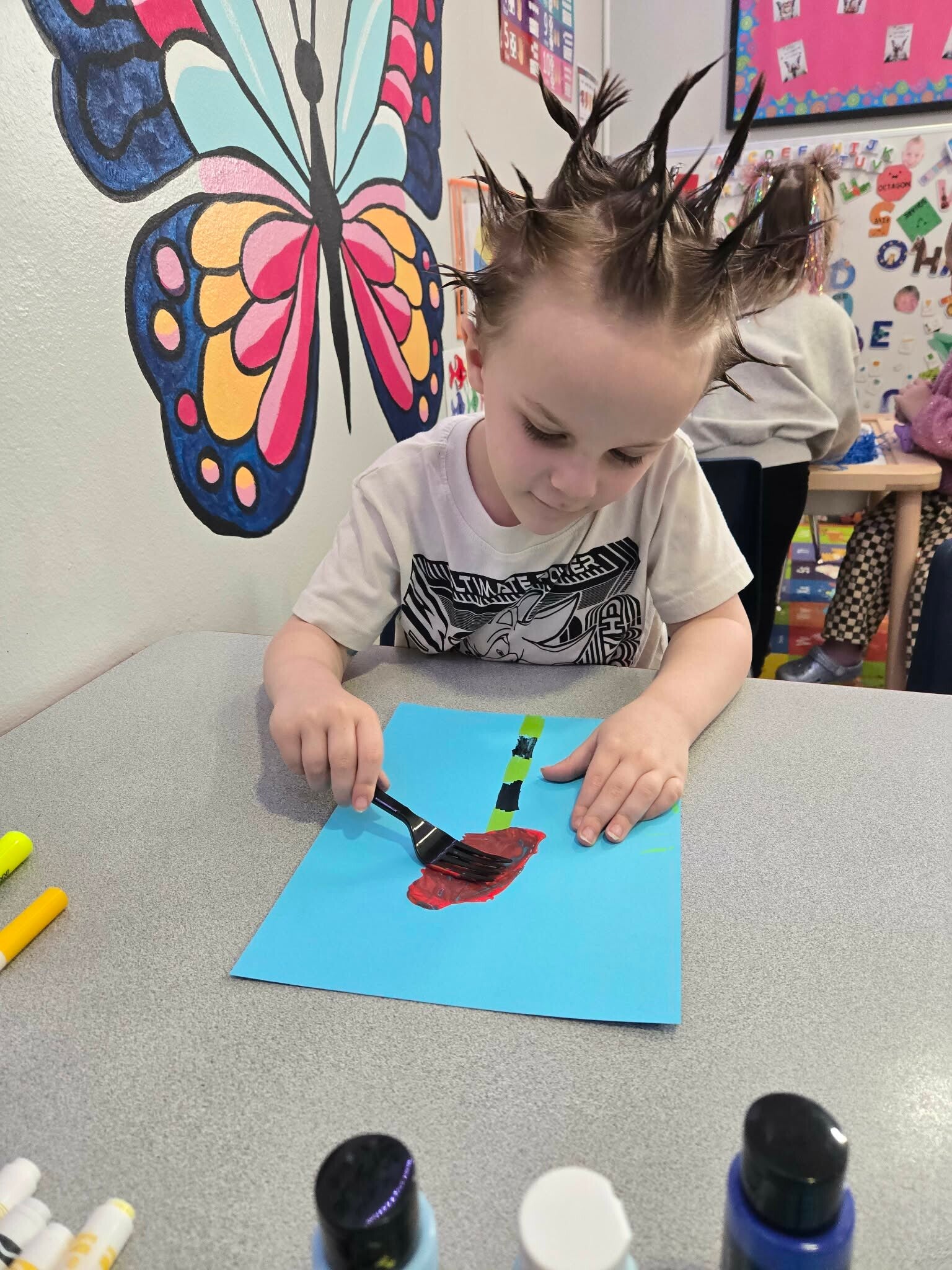 This week we continued to talk about the primary colors. For art we made Truffula trees. They got to pick two primary colors to mix for the top of their trees. We used forks as our art tools. This was fun for them to practice color mixing.