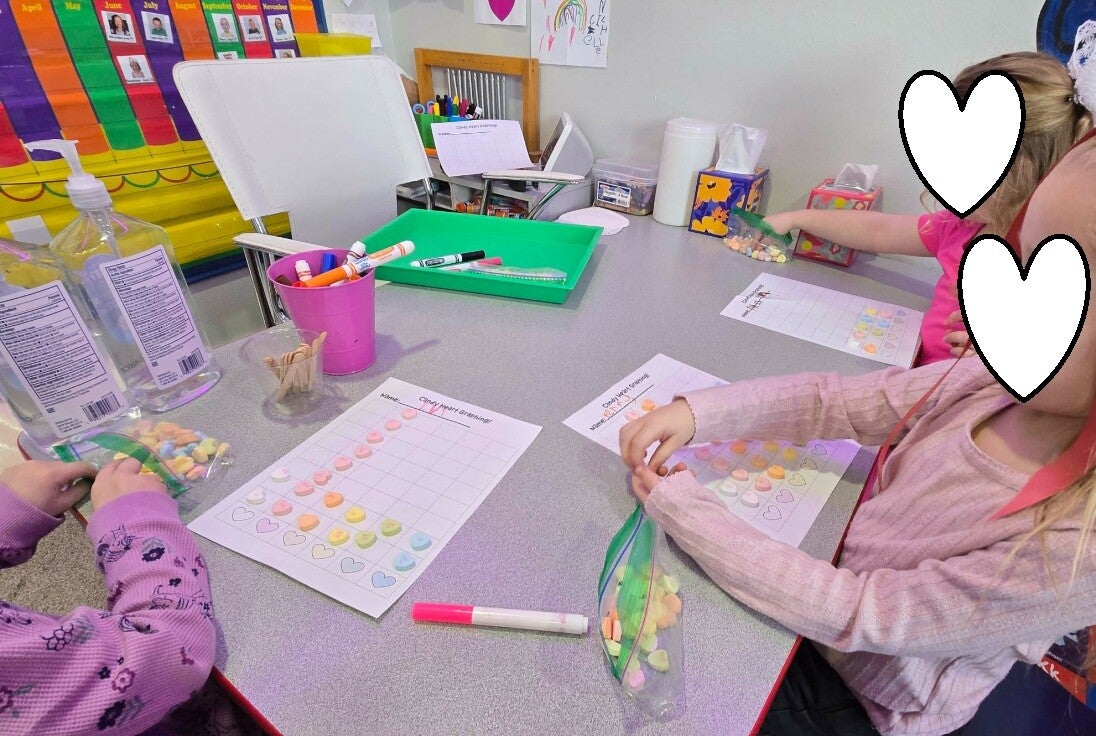 Before our Valentine's Party we did a couple class activities. We did candy heart graphing/counting. The kiddos got a bag of candy hearts. They sorted them according to color. They also counted which heart colors they had the most and least of.