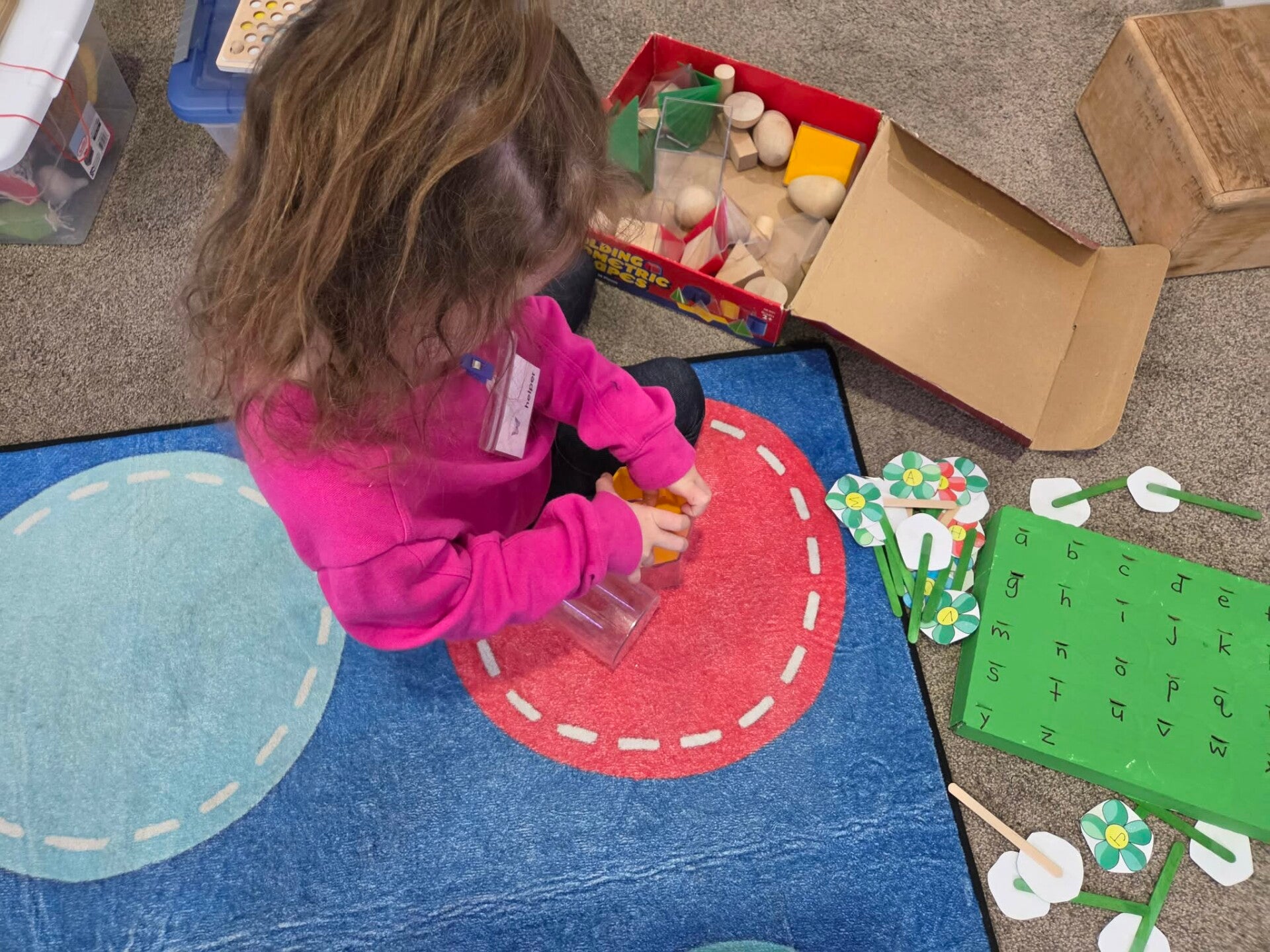 At the carpet center we practiced writing and forming letters. We used magnetic letters, mini writing boards, and wax sticks to make the letters. They could also play with the musical instruments at this center.