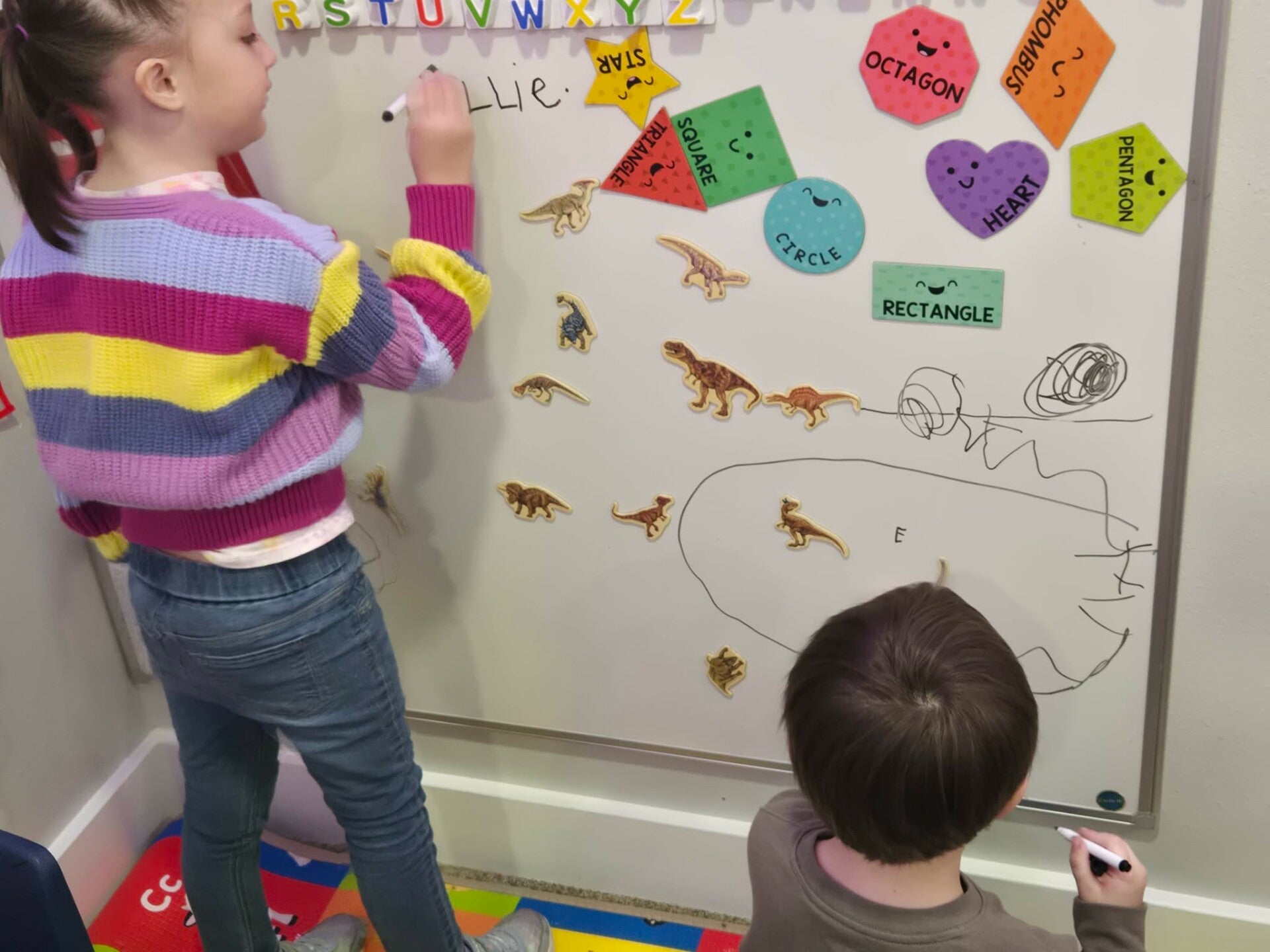 We continued to have a great time getting to know each other better. We are getting so good at names. It has been special to see them make friends. During play time I brought out the whiteboards. This was just an option for them to free write. I wasn't sure if they would pick that over the toys. But, I was wrong. They had the best time with the whiteboards. I will make sure they are available during playtime from now on.