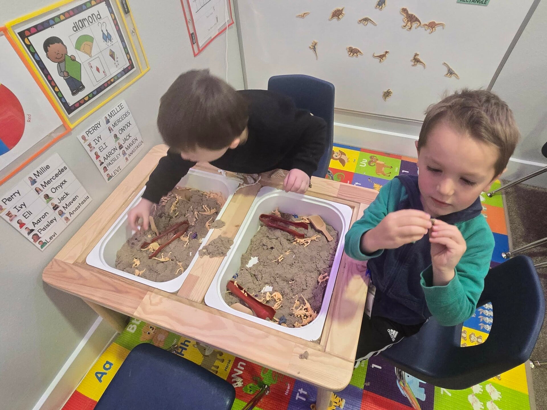 Our sensory table was a hit. We had dinosaur bones buried in kinetic sand. They got to pretend to be paleontologists.
